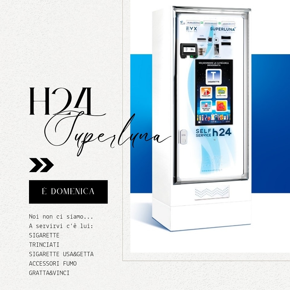 SUPERLUNA è il nostro distributore automatico, il compagno perfetto nei nostri momenti di chiusura. Potrai trovare molta scelta sia come sigarette che come trinciati e accessori da fumo (cartine, filtri e accendini).